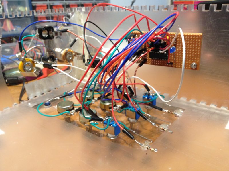 Resumen del dispositivo // 3 canales // Cada canal cuenta con un oscilador que puede ser modulado por potenciometro o LDR, estos se escogen con un switch selector // Volumen y LED reactivo // Entrada CV // Out JACK // ON – OFF general //