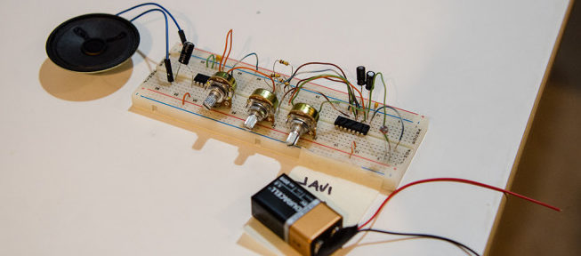 En el taller se creará un dispositivo sonoro análogo, mediante el uso de dos clásicos circuitos integrados (40106 + LM386) que trabajando de manera conjunta generan exquisitos sonidos electrónicos que podrán ser manipulados por sensores de luz, perillas, entre otros.