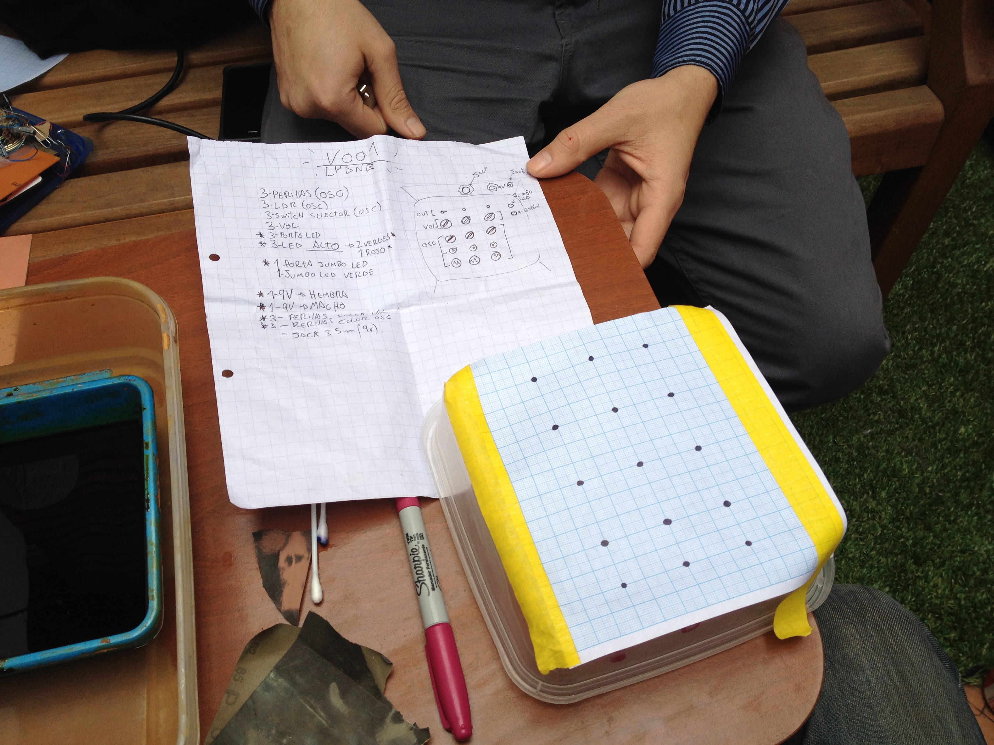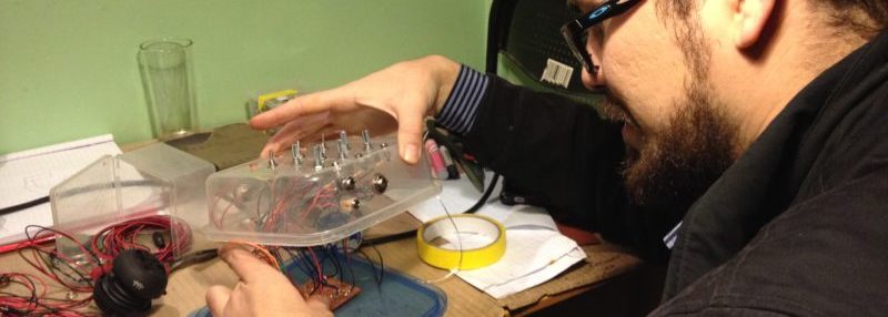 Luego de su taller sintetizador experimental, Luis, quiso realizar el diseño y confección de su dispositivo sonoro, con mucho humor montamos el circuito en un clásico case de alimentos, lo que le dio el nombre a la máquina: «TaperMachineV1»