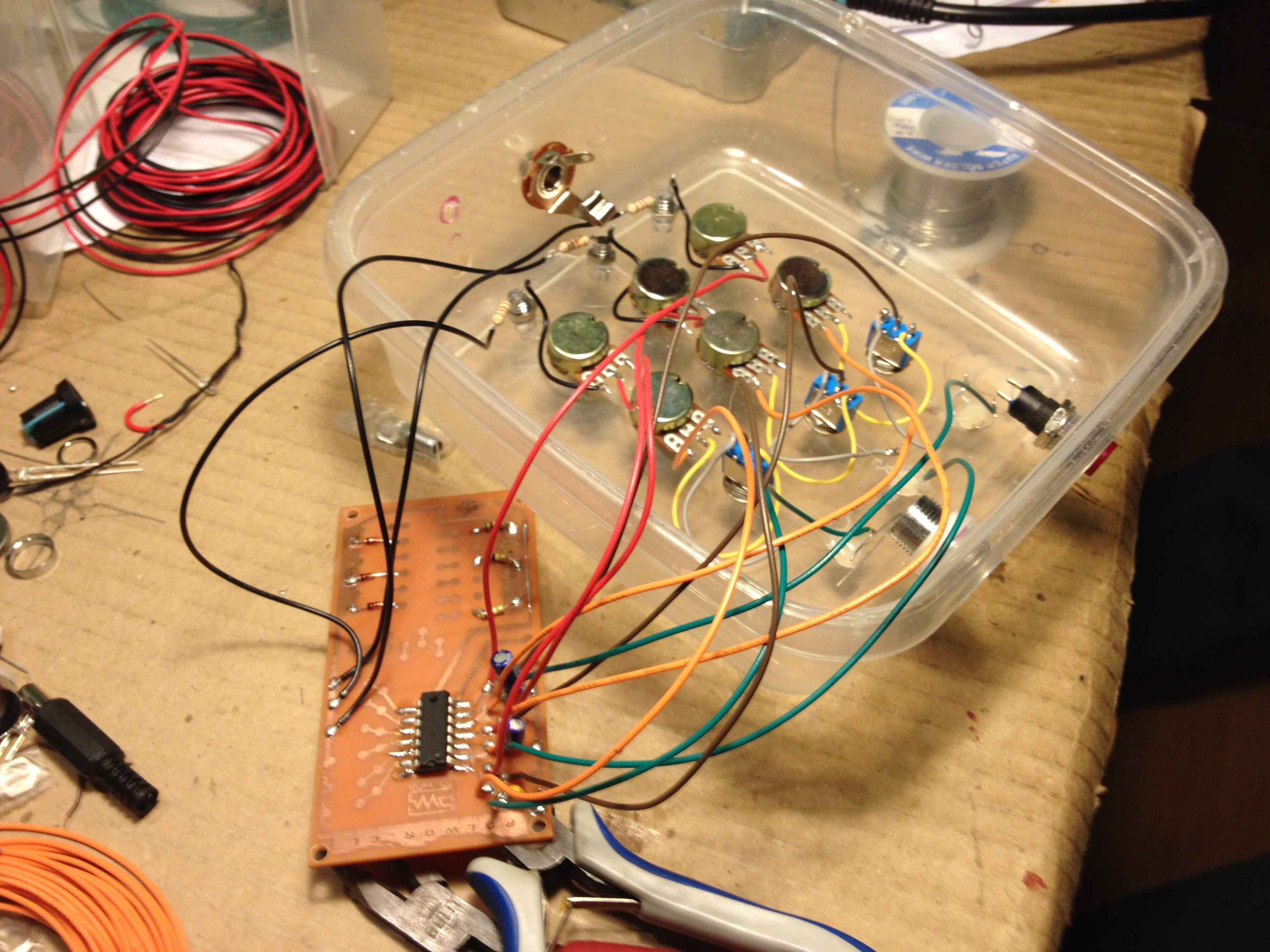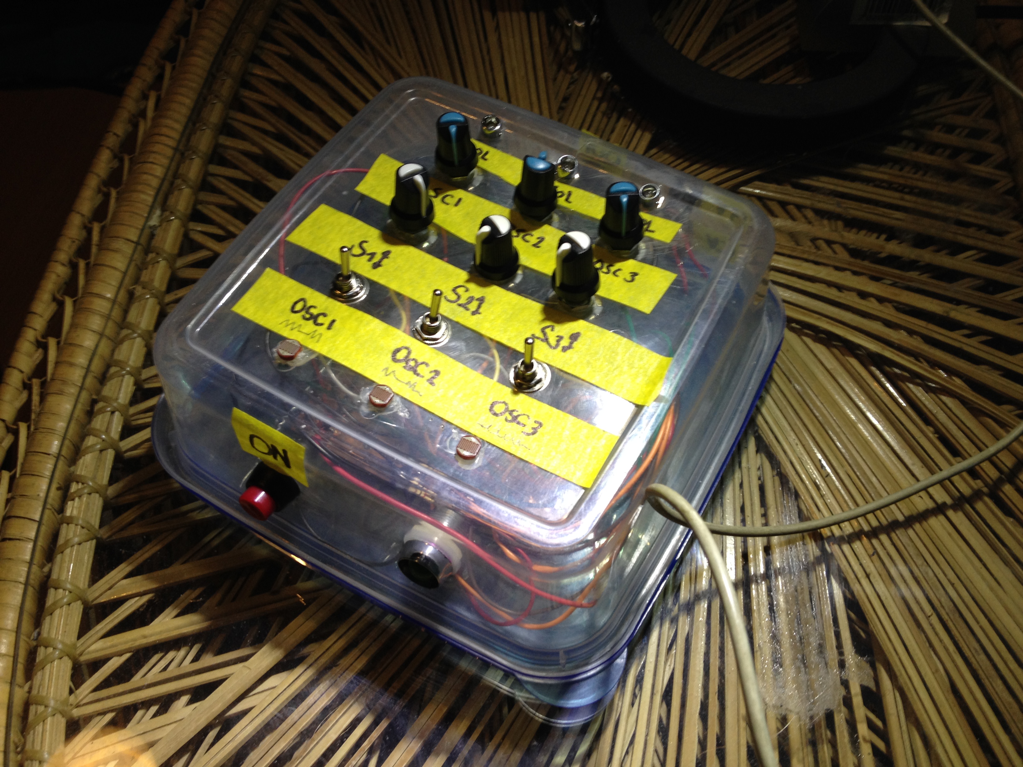 Resumen del dispositivo // 3 canales // Cada canal cuenta con un oscilador que puede ser modulado por potenciometro o LDR, estos se escogen con un switch selector // Volumen y LED reactivo // Entrada CV // Out JACK // ON – OFF general //