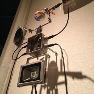 «drumCircle[] es un instrumento automático de percusión y luz compuesto por ocho tambores/focos mecanizados que operan representando el paso del tiempo. Distribuidos circularmente y apuntando hacia el centro de la instalación, estos módulos reproducen patrones de luz y sonido que se distribuyen bidireccionalmente por la sala proponiendo una experiencia ritual y técnica que reflexiona cómo la tecnología determina las nociones que tenemos del espacio y del tiempo.» (Coyarzun 2015)