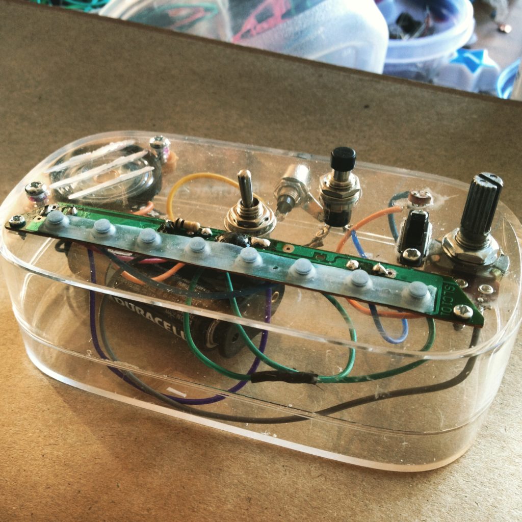 Hackeo simple puesto en una caja plástica transparente para mejorar su aspecto y poder acomodar los componentes.