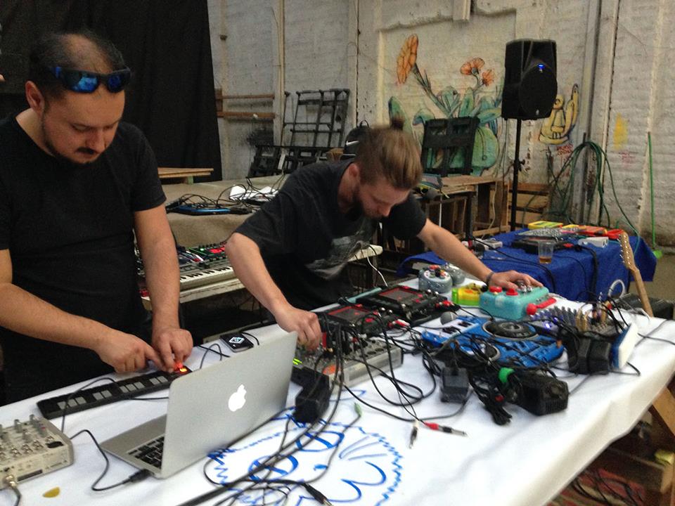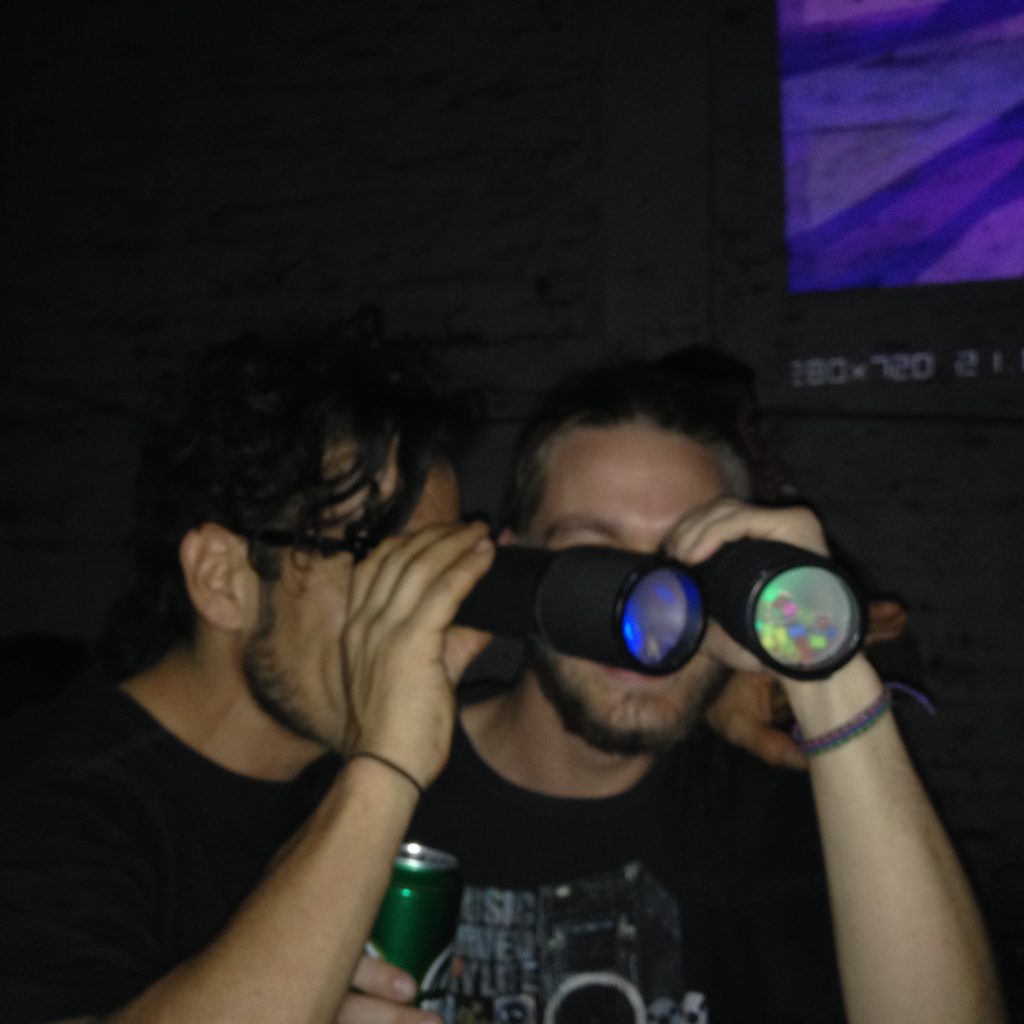 Presentación como Hackeo Juguetes + La bala humana (2015) / En conjunto con el equipo, creamos unos caleidoscopios reactivos al sonido, estos fueron entregados al público haciendo una especie de «visuales personales»