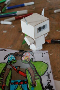 Empezamos a diseñar el traje y a diseñar las máscaras para luego trabajar con cartón y yeso respectivamente.