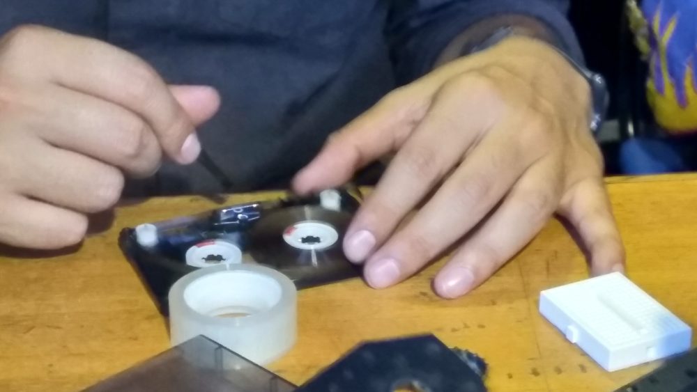 El taller parte con una introducción al desarrollo de la tecnología de la cinta y su utilidad para los compositores de la época, puntualmente la música concreta de Pierre Schaeffer y la técnica de Delia Derbirshire. En lo material se trabaja con un cassette el cual es abierto para dejar al descubierta la cinta magnética de su interior, extraemos un poco de cinta, realizamos un bucle cerrado y volvemos a cerrar el cassette para grabar o escuchar el loop resultante.