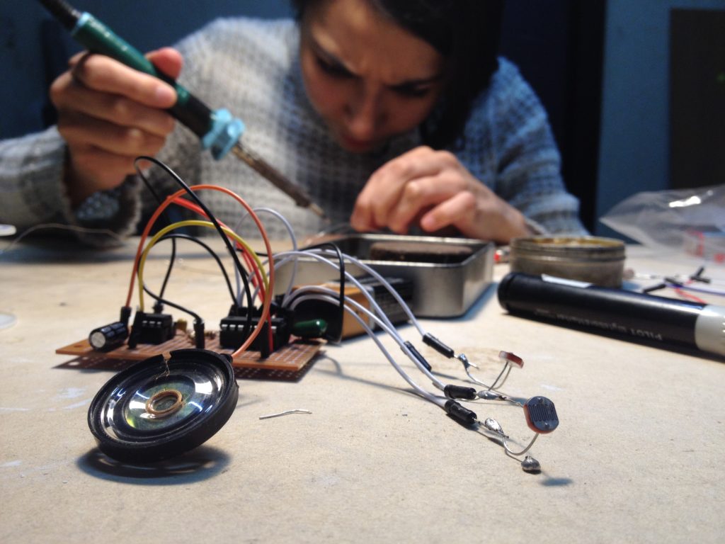 La idea de Carina consistía en la confección de una muñequeras sonoras reactivas a la luz con el circuito aprendido en clases, al parecer la tarea de soldar resultó un tanto más difícil de lo esperado y se acerco a mi taller por ayuda.